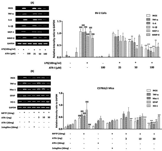 Quantification data are shown in the right panel. (A) mRNA levels (n = 6) of iNOS, TNF-α, IL-6, IL-1β, MCP-1, MMP-9 in BV-2 cells and (B) mRNA levels (n = 4) of iNOS, TNF-α, Mac-1, GFAP, and HO-1 in mice. GAPDH was used as an internal control. $$$ p < 0.001 vs. vehicle group; * p < 0.05, ** p < 0.01, and *** p < 0.001 vs. LPS and MPTP-treated group.