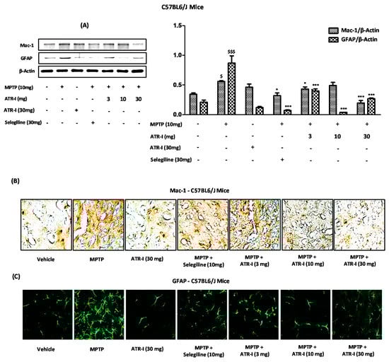 (A) Western blot for Mac-1 and GFAP expression in the STR (n = 3). $ p < 0.05 and $$$ p < 0.001 vs. vehicle group; * p < 0.05, and *** p < 0.001 vs. MPTP-treated group; (B) Representative image presenting Mac-1-positive microglia in the STR of MPTP-intoxicated mice (n = 4); (C) Representative image presenting GFAP-positive astroglia in the STR of MPTP-intoxicated mice (n = 4).