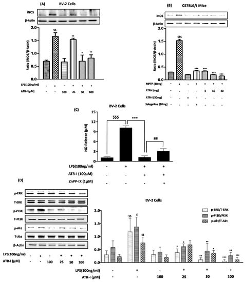 3.5. ATR-I Subsides LPS- and MPTP-Induced Increases of iNOS Expression and Modulates LPS-Induced Phosphorylation of ERK, PI3K, and Akt