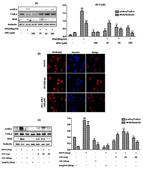 Exposure to LPS (Figure 5A) and MPTP (Figure 5C) significantly increased the protein expressions of p-IκB-α; however, ATR-I significantly reversed the effects of LPS and MPTP on IκB-α phosphorylation, but this effect was not dose-dependent in either of the models. Furthermore, ATR-I significantly inhibited the LPS- and MPTP-induced nuclear translocation of NF-κB/p65, as determined by Western blotting and the immunofluorescence assay (Figure 5B).