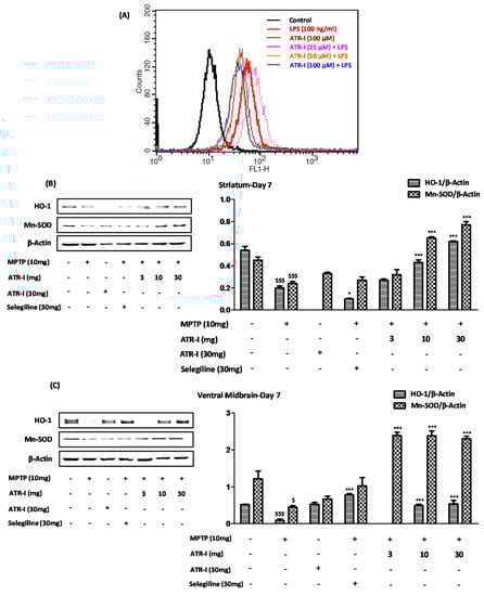 As indicated in Figure 6A, the BV-2 cells that were exposed to LPS exhibited a prominent curve shift toward the right, indicating significant ROS generation. Furthermore, the incubation of the BV-2 cells with ATR-I at varying doses significantly reduced the ROS content, as seen by the curve shift towards the left. The lower dose of 25 µM did not result in a significant reduction of ROS content, and instead exhibited a greater extent of ROS release compared to the LPS exposure, which might have been due to a sample variation. The remaining two doses (50 μM and 100 μM), however, had a similar effect, wherein the LPS-induced ROS release was suppressed in the BV-2 cells. In line with these reports, our results from animal experiments indicate that MPTP significantly decreased the protein levels of HO-1 and MnSOD in the STR (Figure 6B) and VMs (Figure 6C) of the mice, as compared to the vehicle group. However, ATR-I was able to reverse the decreased protein levels of HO-I in the STR and VM, in a dose-dependent fashion.