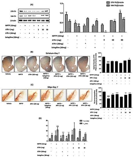 Male C57BL6/J mice (age, 8–9 weeks; weight, 25–28 g) (Samtako Bio Korea, Gyeonggi-do, Korea) were acclimatized for 14 days, prior to the drug treatment. Animal experiments and the experimental procedures were approved by the Institutional Animal Care and Use Committee of Konkuk University. The animals were housed in a controlled environment (23 °C ± 1 °C and 50% ± 5% humidity) and were allowed food and water ad libitum. The room’s lights were switched on between 8:00 a.m. and 8:00 p.m. One hundred and twenty six animals were randomly divided into the following seven groups, comprised of 18 animals each: Vehicle group, MPTP group, ATR-I (30 mg/kg/10 mL) group, Selegiline (10 mg/kg/10 mL) + MPTP, ATR-I (3 mg/kg/10 mL) + MPTP group, ATR-I (10 mg/kg/10 mL) + MPTP group, and ATR-I (30 mg/kg/10 mL) + MPTP group. As demonstrated in the experimental design (Scheme 1), a 10 mg/kg/10 mL MPTP was administered intraperitoneally (i.p.) on four occasions, at an interval of 1 h [16,17], to all of the animals except for those in the vehicle group and ATR-I (30 mg/kg/10 mL) i.e., per se group. Twelve hours after the last MPTP injection, ATR-I (i.p.) or selegiline (i.p.) was administered once daily, for three and seven days. The animals were sacrificed on day three and day seven. The MPTP was freshly prepared in saline before use. ATR-I was suspended in 0.5% methyl cellulose solution containing 1% Tween 80, before dosing. The control/vehicle group was administered as plain methyl cellulose solution.