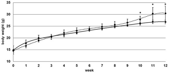 From week 10–12 we observed a higher mean body weight in the control group (p < 0.05) with a maximum at 12 weeks.