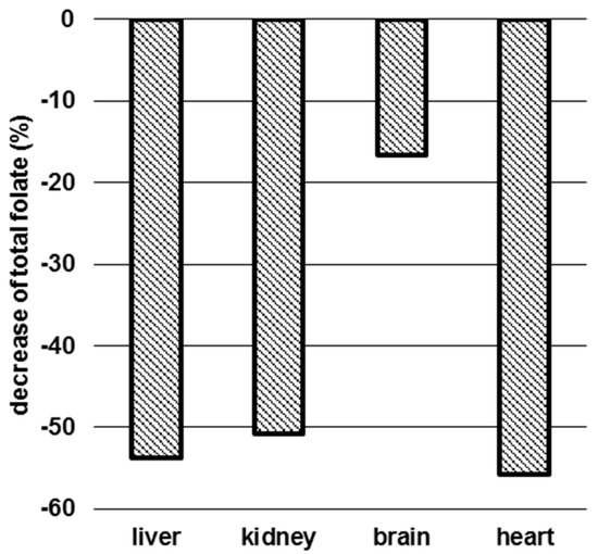 Compared to liver and kidney, folate contents in brain and heart (Figure 6a,b) were about a factor of 35 or 15 lower, respectively.