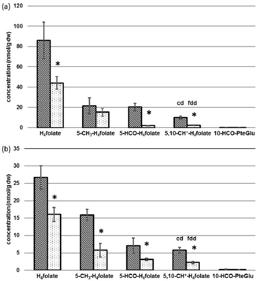 Concentrations of each folate vitamer in liver and kidney depending on diet are depicted in Figure 5a,b.