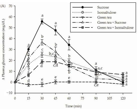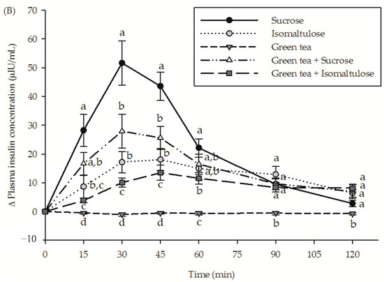 The incremental postprandial plasma (A) glucose concentration and (B) insulin concentration in healthy subjects after consumption of sucrose, isomaltulose, green tea, green tea plus sucrose and green tea plus isomaltulose (n = 15). Data are expressed as means ± SEM. Values not sharing the same superscript were significantly different between test groups in each time point (p < 0.05).