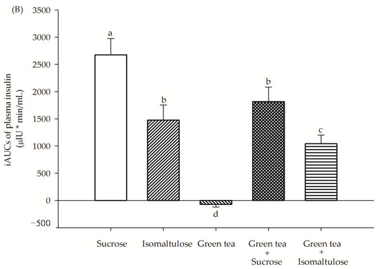 The incremental area under the curves (iAUCs) of plasma (A) glucose and (B) insulin concentration in healthy subjects after consumption of sucrose, isomaltulose, green tea, green tea plus sucrose and green tea plus isomaltulose (n = 15). Data are expressed as means ± SEM. Values not sharing the same superscript were significantly different between test groups (p < 0.05).