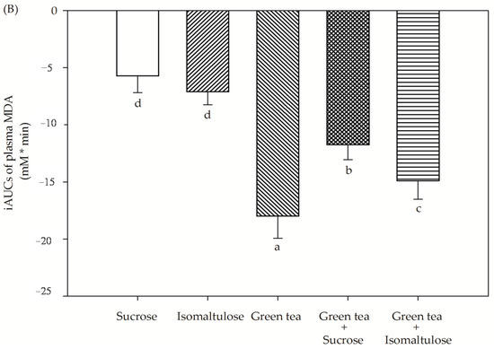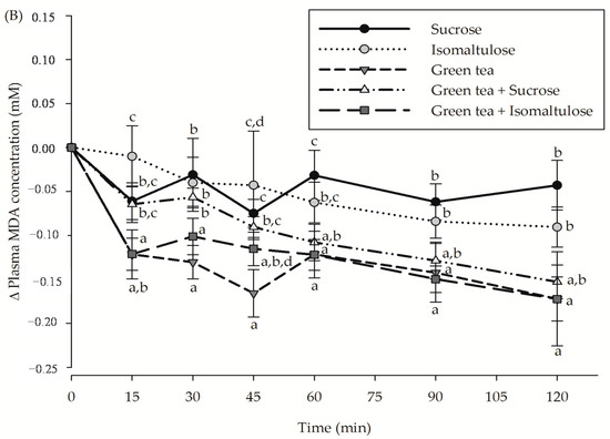 The incremental postprandial plasma (A) FRAP level and (B) malondialdehyde (MDA) concentration in healthy subjects after consumption of sucrose, isomaltulose, green tea, green tea plus sucrose and green tea plus isomaltulose (n = 15). Data are expressed as means ± SEM. Values not sharing the same superscript were significantly different between test groups in each time point (p < 0.05).
