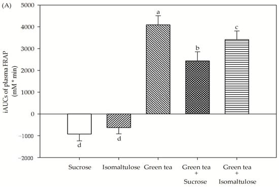 The incremental area under the curves (iAUCs) of plasma (A) FRAP and (B) MDA concentration in healthy subjects after consumption of sucrose, isomaltulose, green tea, green tea plus sucrose and green tea plus isomaltulose (n = 15). Data are expressed as means ± SEM. Values not sharing the same superscript were significantly different between test groups (p < 0.05).