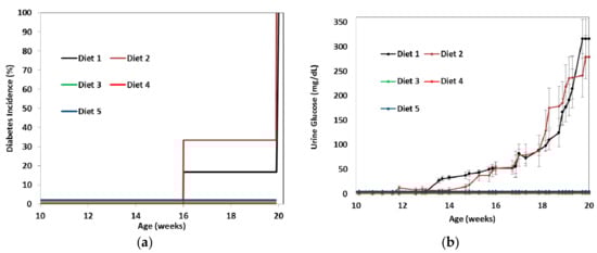 The onset of diabetes was observed only in animals on Diets 1 and 2 (Figure 1). The incidence of diabetes (Figure 1a) in mice was determined according to the following criteria: elevated urine (>150 mg/dL; Figure 1b) and fasting blood glucose levels (>130 mg/dL; Figure 1c).