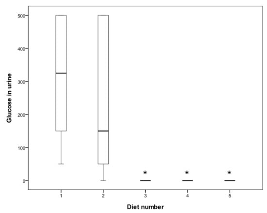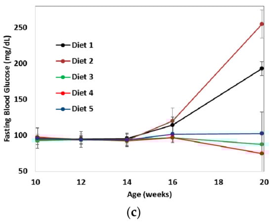 For the first six weeks of the study, there was no difference in fasting blood glucose levels between the animals on different diets (Figure 1c). By day 72, when the mice were 20 weeks old, there was already a significant difference in the glucose blood levels between the diet groups (p < 0.001). Glucose in urine was not detectable in animals on Diets 3, 4 and 5, even at the end of the experiment, while animals on Diets 1 and 2 had significantly elevated glucose in urine (Figure 1b and Figure 2).