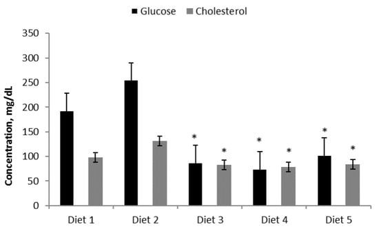 Fasting blood glucose (mg/dL) and cholesterol (mg/dL) levels after 72 days. Diets given: (1) low diabetogenic (non-wheat), (2) standard diabetogenic wheat bread, (3) T. aestivum landrace, (4) T. turgidum ssp. dicoccoides landrace, and (5) T. turgidum spp. dicoccum landrace. Results are presented as means ± standard errors. Differences between Diets 1 and 2 and Diets 3–5 were significant (p < 0.001).
