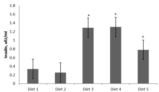 After 72 days, fasting blood glucose levels increased in animals fed Diets 1 (193.2 ± 21.9 mg/dL) and 2 (255.0 ± 24.5 mg/day), compared to animals fed Diets 3 (87.4 ± 13.45 mg/day), 4 (74.6 ± 16.3 mg/day), and 5 (102.7 ± 21.2 mg/day) (Figure 3). The highest cholesterol level was observed for animals fed Diet 2 (Figure 3). With regard to the insulin level (measured in blood after overnight fasting), NOD mice on Diets 1 and 2 had the lowest insulin values (Figure 4), and differences between Diets 1 and 2 and Diets 3–5 were significant (p < 0.001). The fasting blood glucose:insulin ratios were over 10 times greater in Diet 2 than in Diets 3–4 and 6 times greater than in Diet 5.