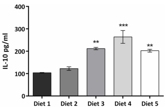 Anti-inflammatory cytokine IL-10 levels (pg/mL) from blood collected on day 72. Results are presented as means ± standard errors. Differences between Diets 1 and 2 and Diets 3–5 were significant (p < 0.01).