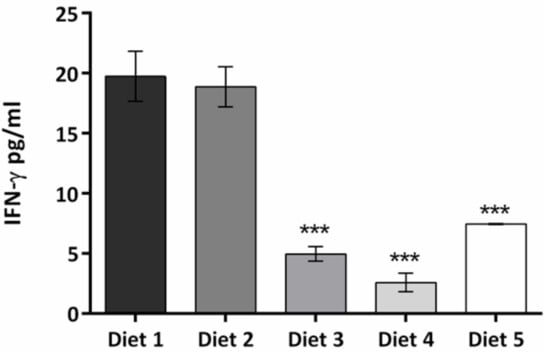 Pro-inflammatory cytokine IFN-γ levels (pg/mL) from blood collected on day 72. Results are presented as means ± standard errors. Differences between Diets 1 and 2 and Diets 3–5 were significant (p < 0.001).