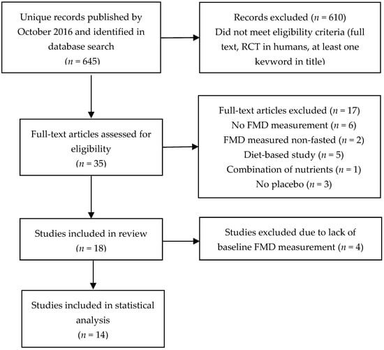 PubMed and Scopus databases were searched for full text reports of randomized controlled trials (RCTs) in humans using the following key words: “long chain omega-3 fatty acids”, “fish oil”, “DHA” or “EPA” in combination with “endothelial function” and “flow-mediated dilatation (FMD)”. For consistency, FMD was limited to brachial artery ultrasound assessment. Exclusion criteria were: no measurement of FMD; measurement of FMD in a non-fasted state; not placebo-controlled; diet-based studies (no specified dose of EPA and DHA); and giving combinations of LCn-3 PUFA with other nutrients without using LCn-3 PUFA alone as a comparator. Six RCTs published between 2012 and October 2016 were identified in addition to 12 reported in the aforementioned meta-analyses (Figure 1).