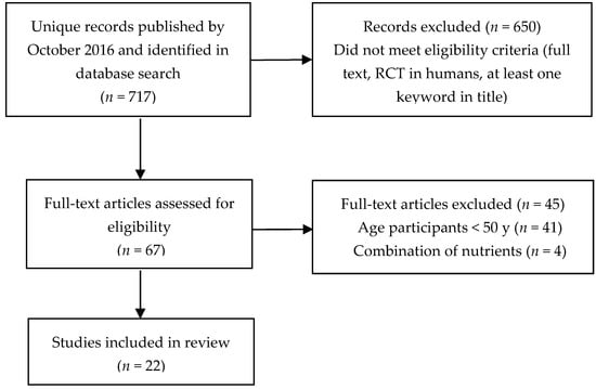 PubMed and Scopus databases were searched for full text reports of RCTs performed in cognitively healthy or impaired adults above the age of 50 using the following key words: “long chain omega-3 fatty acids”, “fish oil”, “DHA” or “EPA” in combination with “cognition” and “cognitive function”. Exclusion criteria were: study participants <50 years old; not placebo-controlled; diet-based studies (no specified dose of EPA and DHA); and giving combinations of LCn-3 PUFA with other nutrients without using LCn-3 PUFA alone as a comparator. This review included 14 RCTs published between 2012 and October 2016 in addition to the eight RCTs reviewed by Mazereeuw et al. in 2012 (Figure 2).