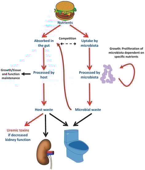 Microbiota–host interaction and modulation by dietary nutrients. When humans feed themselves, they are also feeding their microbiota. The precise nutrients ingested will favor the growth of bacteria that feed on ingested nutrients, in detriment of bacteria that feed on nutrients that a person is not ingesting. The microbiota competes with the host for certain nutrients, such l-carnitine. Thus, oral l-carnitine supplementation promotes the growth of l-carnitine metabolizing bacteria and may result in decreased l-carnitine absorption. Some waste molecules from bacterial feeding will be absorbed systemically and metabolized to uremic toxins that accumulate if not excreted in urine.