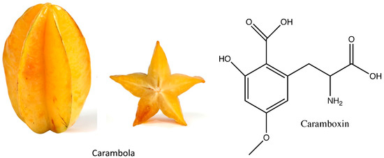Caramboxin is a neurotoxin found in carambola (star fruit, Averrhoa carambola), a tropical fruit. Carambola has antioxidant properties and its use has been recommended to improve the lipid profile [45], depress pro-inflammation cytokines [46] and as a potential treatment for diabetes [47]. Carambola (Figure 2) may be found in supermarkets around the globe, but its toxicity in CKD patients remains poorly recognized by the general population and even less by those unaware of being CKD patients. The toxic effect of carambola was first reported in 1980 [48], but caramboxin was not described until 2013 [49]. Caramboxin is a nonpeptide amino acid, phenylalanine-like molecule that inhibits the GABAergic system through a glutamatergic ionotropic molecular action, having potent excitatory properties [49]. From 2000 to 2014 neurotoxicity related to carambola ingestion was reported in 110 patients, of whom 27 died [50]. The vast majority had CKD and developed neurotoxicity resulting from accumulation of caramboxin due to reduced renal excretion. However, the carambola fruit is also nephrotoxic and may cause both acute kidney injury (AKI) and neurotoxicity [51,52]. The amount of fruit consumed ranged from a glass of juice to 4 carambolas and symptoms started between 2 h and 2 days after ingestion. The initial presentations included uncontrollable hiccups (a typical manifestation found in over 90% of patients), vomiting, mental confusion, seizures, coma and death [50]. Daily hemodialysis or continuous renal replacement methods is the therapy of choice for severe cases [53]. While oxalate nephropathy has been observed in renal biopsies from patients with carambola nephrotoxicity, the potential contribution of caramboxin to kidney injury has not been studied. In this regard, carambola juice is directly toxic for cultured tubular cells [54] and glutamatergic signaling was identified as a potential contributor to AKI by a systems biology, kidney tissue proteomics-based approach [55].