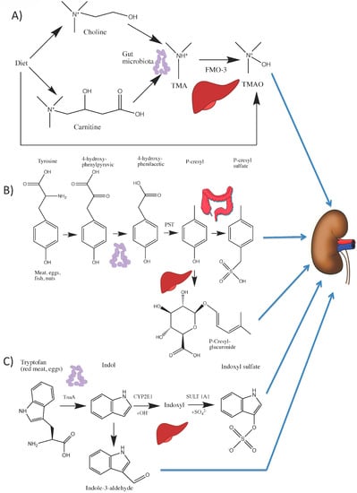 Some nutrients from food are processed by the gut microbiota to generate uremic toxins or precursors that are metabolized to toxins in the body. Trimethylamine N-Oxide (TMAO), p-cresyl-sulfate (pCS), indoxyl-sulfate (IS) and indole-3 acetic acid (IAA) are key uremic toxins originating from dietary nutrients (Figure 3 and Figure 4).