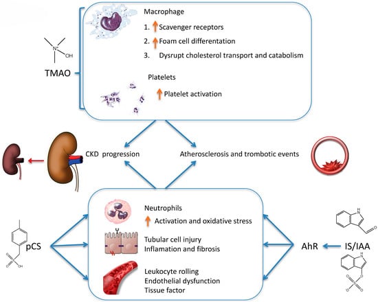 The uremic toxicity of IS was recently reviewed and a role in vascular and renal disease progression was suggested [127]. In CKD patients, IS levels were inversely related with renal function and directly related to aortic calcification, and predicted all-cause and cardiovascular mortality [128], although not in all studies [129] and the association with CKD progression is weaker than for pCS [129]. IS may favor fibrosis and cellular senescence through activation of NADPH oxidase to generate reactive oxygen species (ROS), NFκB activation, Klotho downregulation, TGF-β1 secretion, and inflammatory molecule (ICAM-1 and MCP-1) and senescence-related molecule (p21) expression [123,130]. IS may also be nephrotoxic, as it induced ER stress in tubular cells and inhibited cell proliferation [131]. In mice, IS suppressed endothelial progenitor cell-mediated neovascularization in ischemic limbs [132]. IS activates the aryl hydrocarbon receptor (AHR) that in turn interacts directly with and stabilizes functional tissue factor, preventing its ubiquitination and degradation and favoring thrombosis [133,134,135]. IS also enhanced platelet activities, including responses to collagen and thrombin, platelet-derived microparticles and platelet-monocyte aggregates, favoring thrombosis [136] and is a risk factor for dialysis graft thrombosis after endovascular interventions [137]. By contrast, AHR antagonists decreased tissue factor and were anti-thrombotic in uremia [133]. In the rat peritoneal vascular bed, IS disrupted the glycocalyx and induced strong leukocyte adhesion, enhanced extravasation, and interrupted blood flow [138]. IS also interferes with erythropoietin production, potentially favoring anemia in CKD patients [139], increases oxidative stress in osteoblasts, inducing PTH resistance and favoring adynamic bone disease [140] and promoted insulin resistance [141]. IS accumulated in muscles in murine CKD and caused mitochondrial dysfunction and decreased ATP availability in muscle cells. In CKD patients plasma IS inversely associated with and skeletal muscle mass [142].