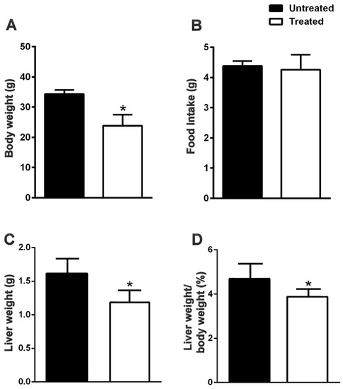 At the end of the treatment, the untreated mice had greater mass gain compared to the animals treated with NDS (Figure 1A), although no difference in the food intake was observed (Figure 1B). Furthermore, the liver weight (Figure 1C) and ratio liver weight/body weight (Figure 1D) was higher than the treated group. In the untreated mice, steatosis affected the liver gross appearance.