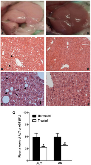 In particular, the organ appeared enlarged with rounded edges. Moreover, it was pale-yellowish color, friable with a greasy texture attributable to the fat accumulation in the hepatic parenchyma (Figure 2A). Histologically, the liver exhibited micro- and macro-vesicular steatosis (Grade I: >5%–33%) in the perivenular area (Zone 3) and transition area (Zone 2) (Figure 2C) with focal infiltration of polymorphonuclear cells (Figure 2E). The hepatocytes showed a typical foamy aspect; numerous small vacuoles coalesced and created cleared space displacing the nucleus to the periphery of the cells (Figure 2E). On the contrary, in the NDS-treated mice, the liver gross anatomy was not affected by fat accumulation (Figure 2B), and the histological analysis did not reveal the presence of steatosis (Grade 0: <5%), but only the presence of small inclusions of lipids within hepatocytes (Figure 2D–F). Moreover, in agreement with the liver maintaining the lobular architecture, plasma AST and ALT were significantly lower in treated mice than in the untreated ones (Figure 2G).
