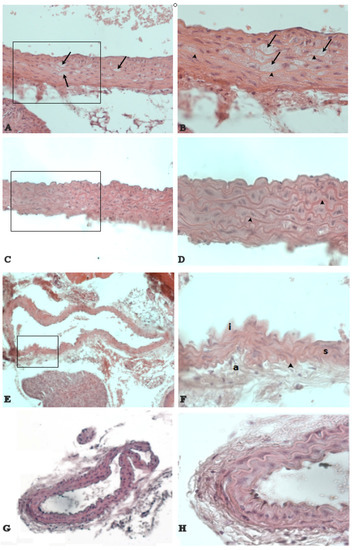 Untreated mice showed atherosclerotic lesions with features of the earliest stages of the disease. In fact, the observed lesions did not develop beyond the fatty-streak presence. The lesions of aorta were confined to the aortic root and were characterized predominantly by lipid-laden areas in the tunica media, between smooth muscle cells and elastic lamina (Figure 5A,B). Carotid arteries showed an increased thickening of the intima characterized by hyperplasia and the presence of myocytes proliferating from the tunica media (Figure 5E,F). On the contrary, in NDS-treated mice, neither lesions in aortic root (Figure 5C,D), nor carotid intimal hyperplasia and alterations in the tunica media or adventitia (Figure 5G,H) were observed.