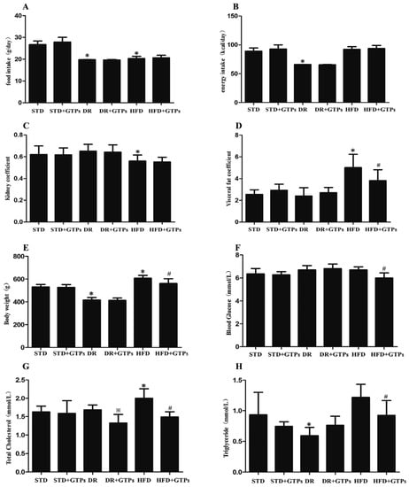 Compared to the STD group (Figure 1), body weight, visceral fat coefficient, and total cholesterol were markedly increased and kidney coefficient was significantly decreased in HFD, while body weight and triglyceride levels were decreased significantly in DR group (p < 0.05). In addition, GTPs improved body weight, visceral fat coefficient and kidney coefficient of HFD-fed rats (p < 0.05), and reduced blood glucose, triglyceride, and total cholesterol levels in HFD group (p < 0.05), even though there was no significant difference of energy intake between HFD and HFD+GTPs. GTPs reduced total cholesterol levels of DR-fed rats compared to DR group (p < 0.05).