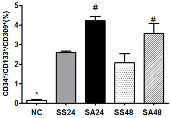 Distribution of circulating proangiogenic cells (CD34+/CD103+/CD309+) among the normal control (NC), sepsis with saline 24 h post-cecal ligation and puncture (CLP) (SS24), sepsis with arginine 24 h post-CLP (SA24), sepsis with saline 48 h post-CLP (SS48), and sepsis with arginine 48 h post-CLP (SA48) groups. All data are representative of duplicate measurements (n = 8). Data are presented as the mean ± SD. * Significantly differs from the sepsis group. # Significantly differs from the SS group at the same time point (p < 0.05).