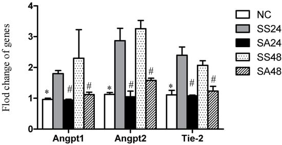 The SS groups had higher expression of Angpt-1, Angpt-2, and Tie-2 mRNAs after CLP than those in the NC group. In general, the SA groups had significantly lower expression of the Angpt/Tie-2 genes than that of the SS groups at either time points. Furthermore, the degree of reduced expression of all three genes were comparable to that of the NC group (Figure 2).