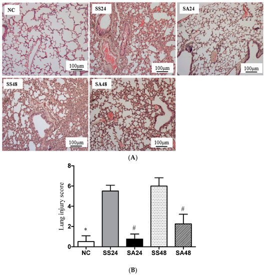 (A) Histopathology of the lung tissues; (B) Quantification of histological lung injury scores. All data are representative of duplicate measurements (n = 6). Data are presented as the mean ± SD. * Significantly differs from the sepsis group. # Significantly differs from the SS group at the same time point (p < 0.05).