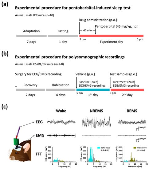 The experimental procedure and timeline for the pentobarbital-induced sleep test is shown in Figure 1a. All experiments were performed between 1:00 p.m. and 5:00 p.m., and mice were fasted for 24 h before experiment onset. Mice (n = 10) orally received drugs 45 min before pentobarbital injection. Control mice (5% tween 80-saline, 10 mL/kg) were tested in parallel with animals receiving drug treatments. After the administration of pentobarbital (45 mg/kg, i.p.), mice were placed in individual cages and observed for measurements of sleep latency and duration. Sleep latency was recorded from the time of pentobarbital injection to the time of sleep onset, and sleep duration was defined as the difference in time between the loss and recovery of the righting reflex. Observers who scored these variables were blinded to the treatment groups.
