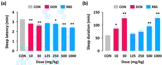 As a first step in evaluating the hypnotic activity of RBS, we performed a pentobarbital-induced sleep test on mice as this paradigm is often useful for evaluating sedative-hypnotic activity []. Our results clearly showed that, similar to an established insomnia medication, DOX, RBS significantly potentiated pentobarbital-induced sleep in mice (Figure 2). However, the potential of RBS as an effective natural sleep aid could not be solely determined using this primary result. Therefore, we further evaluated the sleep-promoting effects of RBS using a caffeine-induced sleep disturbance model, as well as an analysis of sleep structure and profiles based on EEG and EMG recordings.