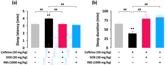 In order to identify additional hypnotic effects of RBS, we investigated whether RBS could attenuate a sleep disturbance introduced by caffeine–a routinely consumed stimulant that may cause symptoms of insomnia [,]. In the present study, caffeine (50 mg/kg, p.o.) significantly (p < 0.01) inhibited pentobarbital-induced sleep in mice due to its well-known wake-promoting effect (Figure 3). Co-administration of RBS (1000 mg/kg) or DOX (30 mg/kg) with caffeine (50 mg/kg) significantly (p < 0.01) decreased sleep latency and increased sleep duration as compared to the caffeine alone group. This suggests that RBS and DOX both possess the ability to counteract the wake-promoting effect of caffeine.