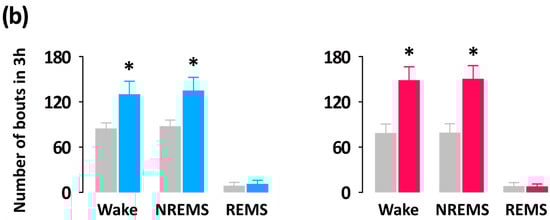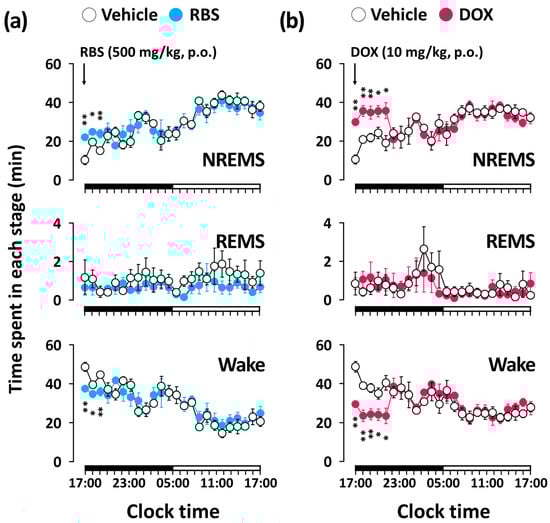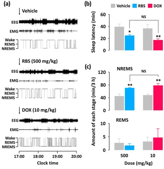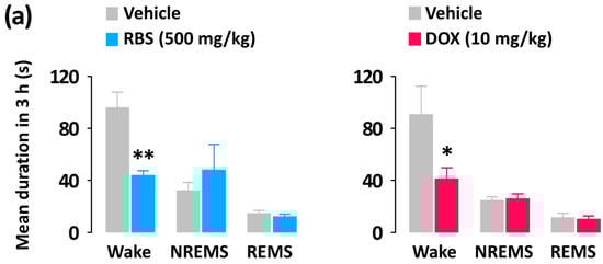 Unlike the pentobarbital-induced sleep test, which addresses sleep latency and duration, analyses of sleep architecture and profile based on EEG and EMG recordings provide various parameters that are useful in evaluating the sleep-promoting effects of a drug []. Thus, in the present study, we evaluated the hypnotic effects of RBS on normal sleep in mice through evaluations of sleep architecture and sleep profile. Since normal sleep in rodents is physiologically fragmented, it could, by itself, represent a model of insomnia []. As nocturnal animals (e.g., rodents) rest during the day, evaluating the hypnotic effects of a drug in animals that are already prone to sleep during these hours may not be appropriate []. Thus, RBS and DOX were administered at 17:00, which corresponded to the beginning of the lights-off period. Using this approach, we found that both RBS and DOX significantly decreased sleep latency and increased the amount NREMS, but did not influence REMS (Figure 4). Moreover, the significant RBS-mediated increase in NREMS lasted for the first 3 h after administration, and had no further influence on sleep architecture (Figure 5). These results suggest that RBS was effective in increasing NREMS without causing adverse effects after sleep induction []. Finally, both RBS and DOX significantly decreased the mean duration of waking bouts, but increased the total number of waking and NREMS bouts (Figure 6). Together, these results clearly indicate that, similar to DOX, RBS was effective in inhibiting the maintenance of Wake [].