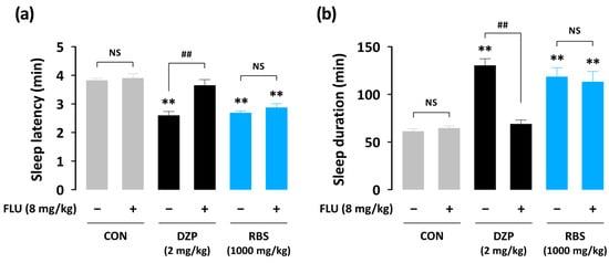 Effects of the GABAA-BZD receptor antagonist, FLU, on changes in sleep latency (a) and sleep duration (b) in ICR mice treated with DZP (2 mg/kg) and RBS (1000 mg/kg). Drugs were administered (p.o.) to mice 45 min before the injection of pentobarbital (45 mg/kg, i.p.). FLU (8 mg/kg, i.p.) was injected 10 min before the administration of test samples. Each column represents mean ± SEM (n = 10). ** p < 0.01, significant difference when compared to the CON group (Dunnett’s test). ## p < 0.01, significant difference between treatment with FLU and treatment without FLU (unpaired Student’s t-test). CON, control; DZP, diazepam; FLU, flumazenil; NS, not significant; RBS, rice bran supplement.