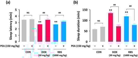 Effects of the H1R agonist, PEA, on changes in sleep latency (a) and sleep duration (b) in ICR mice treated with DOX (30 mg/kg) and RBS (1000 mg/kg). Drugs were administered (p.o.) to mice 45 min before the injection of pentobarbital (45 mg/kg, i.p.). PEA (150 mg/kg, i.p.) was injected 10 min before the administration of test samples. Each column represents mean ± SEM (n = 10). ** p < 0.01, significant difference when compared to the CON group (Dunnett’s test). ## p < 0.01, significant difference between treatment with PEA and treatment without PEA (unpaired Student’s t-test). CON, control; DOX, doxepin hydrochloride; NS, not significant; PEA, 2-pyridylethylamine dihydrochloride; RBS, rice bran supplement.