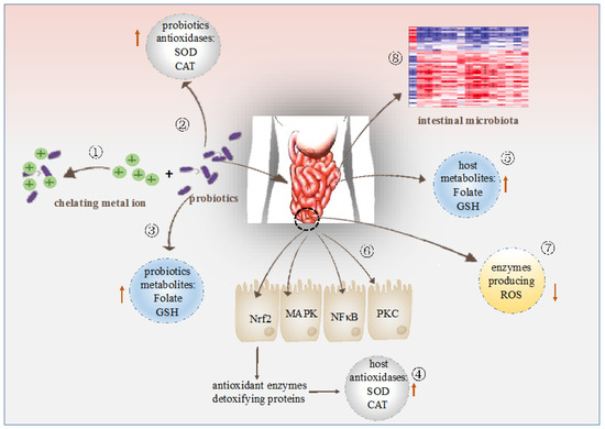 Modulation of antioxidation by probiotics. ① Probiotics chelate metal ion. ② Probiotics possess their own antioxidases. ③ Probiotics produce antioxidant metabolites. ④ Probiotics up-regulate antioxidase activities of the host. ⑤ Probiotics increase levels of antioxidant metabolites of the host. ⑥ Probiotics regulate signaling pathways. ⑦ Probiotics down-regulate activities of enzymes producing ROS. ⑧ Probiotics regulates intestinal microbiota.