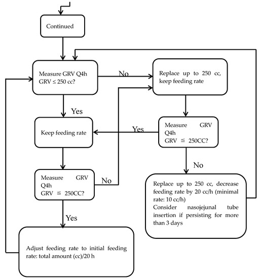 - Binnekade, J.M.; Tepaske, R.; Brynzeel, P.; Mathus-Vliegen, E.M.; de Hann, R.J. Daily enteral feeding practice on the ICU: Attainment of goals and interfering factors. Crit. Care Med. 2005, 9, R218–R225. [Google Scholar]