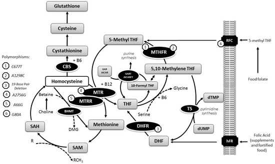 One-carbon metabolism plays an important role in complex and essential metabolic pathways, as hundreds of intracellular transmethylation reactions, including DNA methylation and DNA synthesis, have been implicated in carcinogenesis [1] and processes closely associated with homocysteine (Hcy) metabolism [2]. Vitamins, particularly folate (B9) and other B vitamins, such as B6 and B12, are essential co-factors of one-carbon metabolism (Figure 1) [3].