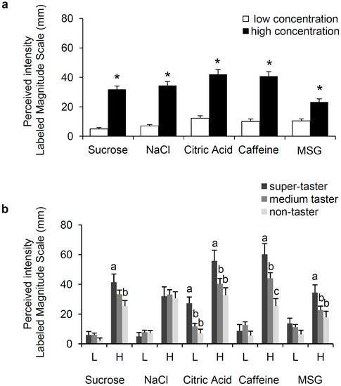 - Miller, I.J., Jr.; Reedy, F.E., Jr. Variations in human taste bud density and taste intensity perception. Physiol. Behav. 1990, 47, 1213–1219. [Google Scholar] [CrossRef]