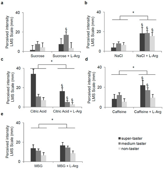 - Melis, M.; Arca, M.; Aragoni, M.C.; Cabras, T.; Caltagirone, C.; Castagnola, M.; Crnjar, R.; Messana, I.; Tepper, B.J.; Tomassini Barbarossa, I. Dose-Dependent Effects of l-Arginine on PROP Bitterness Intensity and Latency and Characteristics of the Chemical Interaction between PROP and l-Arginine. PLoS ONE 2015, 10, e0131104. [Google Scholar] [CrossRef] [PubMed]