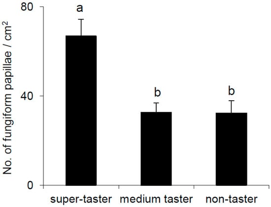 - Essick, G.; Chopra, A.; Guest, S.; McGlone, F. Lingual tactile acuity, taste perception, and the density and diameter of fungiform papillae in female subjects. Physiol. Behav. 2003, 80, 289–302. [Google Scholar] [CrossRef] [PubMed]