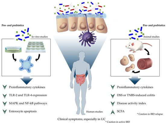 Several experimental methods are available to assess the effect of probiotics or synbiotics on intestinal diseases, especially their anti-inflammatory properties. Both in vitro and in vivo studies have been conducted. In vitro studies principally involve intestinal porcine epithelial cells (IPEC) J2, CaCo-2 cells, human dendritic cells (DC) obtained from peripheral blood and umbilical cord blood, monocyte-derived DCs, peripheral blood mononuclear cells, and intestinal T cells [31,32,33]. In vivo studies involve animal models (mice, rats, and dogs) with chemical inflammation induction or human patients. Despite this variety of studies, however, the mechanisms underlying the beneficial effects of probiotics or synbiotics remain incompletely understood.