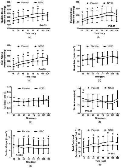 (a) Systolic Blood Pressure; (b) Diastolic Blood Pressure; (c) Mean Arterial Pressure; (d) Heart Rate; (e) Ejection Time; (f) Stroke Volume; (g) Cardiac Output; (h) Total Peripheral Resistance during a 120-s 30%iMVC of the quadriceps muscle for placebo and after 7-days intake of NZBC (New Zealand blackcurrant) extract capsules. Data are mean ± SD. * difference between placebo and NZBC extract (p < 0.05).
