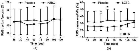Normalised root mean square (RMS) of the rectus femoris muscle (a) and the vastus medialis muscle (b) during a 120 s 30%iMVC for placebo and after 7-days intake of NZBC (New Zealand blackcurrant) extract capsules. Data are mean ± SD. * difference between placebo and NZBC extract.