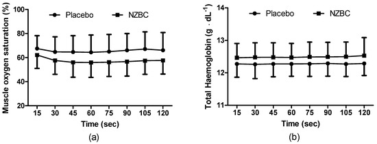 At rest, there was a strong trend for SmO2% to be lower following NZBC (NZBC: 64 ± 12, PL: 70 ± 11%, p = 0.067) with no difference in THb concentration (NZBC: 12.4 ± 0.4, PL: 12.2 ± 0.3 g∙dL−1, p = 0.145).