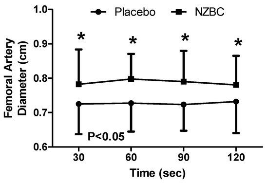 During the sustained isometric contraction, there was a difference between the conditions (F(1,48) = 35.56, p < 0.001), with no difference observed across time (F(3,48) = 0.03, p = 0.993) or an interaction effect (F(3,48) = 0.23, p = 0.874). Post hoc testing identified femoral artery diameter to be greater with NZBC (Figure 4) at 30 (p = 0.009, d = 0.52), 60 (p = 0.003, d = 0.80), 90 (p = 0.021, d = 0.82) and 120 s (p = 0.022, d = 0.58) with increases of 6.9% (12 of 13 participants increased), 8.2% (12 of 13 participants increased), 7.7% (11 of 13 participants increased) and 6.0% (11 of 13 participants increased).