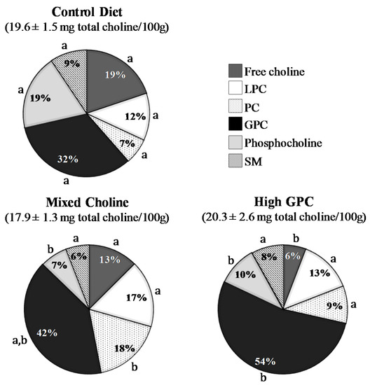 Contribution of choline-containing metabolites to total choline from 3-week-old pups’ stomach content. Values are presented as a percentage of contribution to total choline content (n = 6 per diet group). GPC, glycerophosphocholine; LPC, lysophosphatidylcholine; PC, phosphatidylcholine; SM, sphingomyelin; p value of the main effect of diet from the one-way ANOVA in SAS for total choline (p = 0.657), free choline (p = 0.003), LPC (p = 0.052), PC (p < 0.001), GPC (p = 0.022), phosphocholine (p =< 0.001), and SM (p = 0.216). Means that do not share a common superscript letter are significantly different (p < 0.05) according to post hoc analysis using the DUNCAN adjustment. Analysis performed on log-transformed values for LPC and PC.